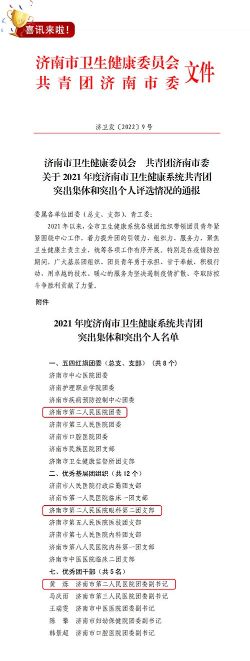 近日,济南市卫生健康委员会、共青团济南市委对2021年度济南市卫生健康系统共青团突出集体和突出个人评选进行通报表彰,萝莉社 荣获“五四红旗团委”荣誉称号,萝莉社 眼科第二团支部荣获“优... -