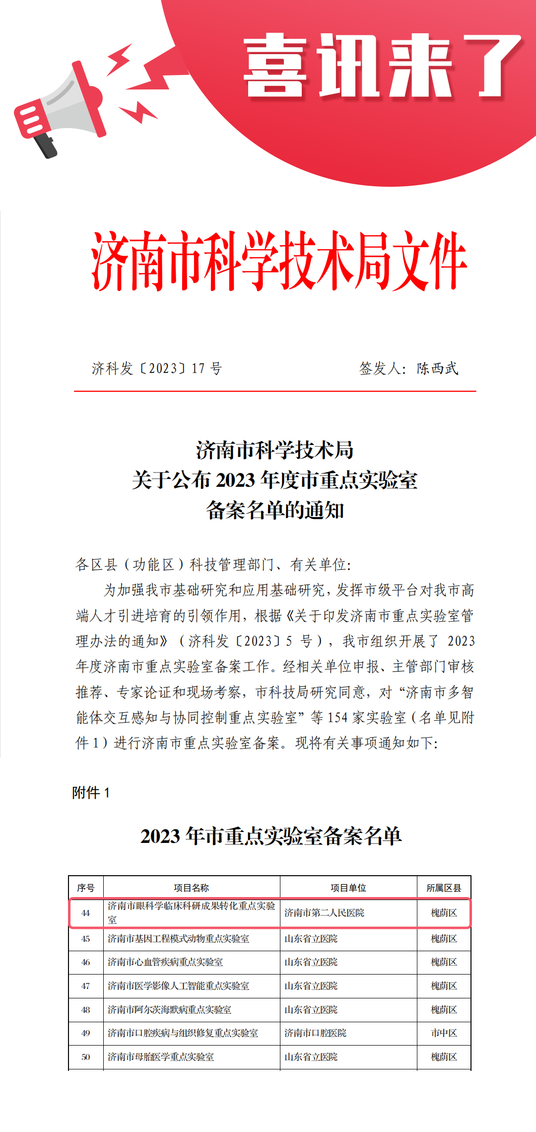 济南市二院申报的市眼科学临床科研成果转化重点实验室成功入选2023年度市重点实验室