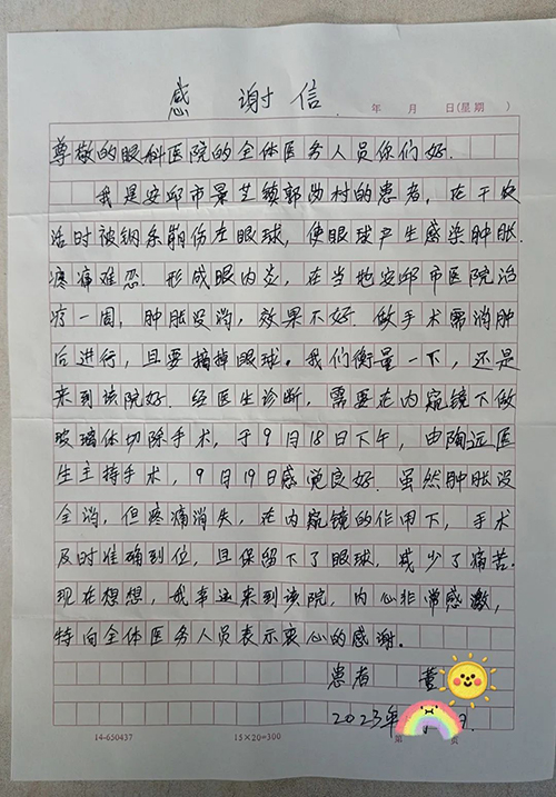 近日,萝莉社 眼一科病区收到了一封来自患者的感谢信,患者在信中表达了对术后效果的满意,字里行间都道出了对萝莉社 医务人员的认可和感激之情! 家住潍坊安邱的董大爷在干农活时,不慎被钢条... -